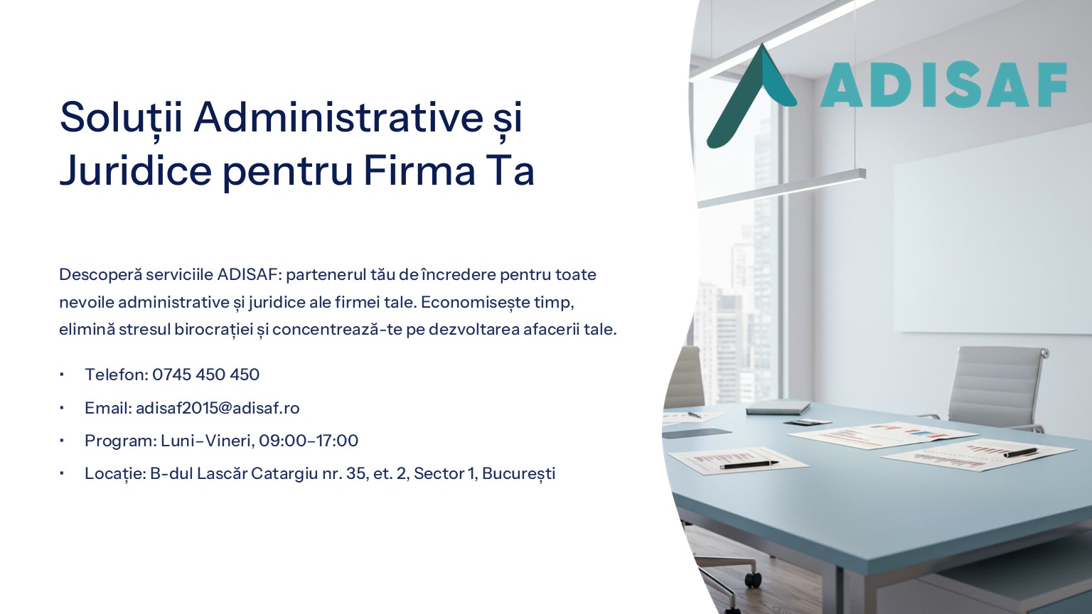 ADISAF preia în întregime aceste sarcini, economisind timp și resurse antreprenorilor. „Rolul nostru este să ne ocupăm de hârtii, astfel încât clienții să se concentreze pe business”, spun reprezentanții companiei.